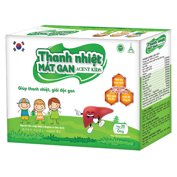 THANH NHIỆT MÁT GAN ACENT KIDS Thành phần: Sài đất…………………………………………………….2500mg Kim ngân hoa…………………………………………..2500mg Thương nhĩ tử…………………………………………1500mg Actiso…………………………………………………….1500mg Diệp hạ châu…………………………………………..1000mg Hạ khô thảo……………………………………………..500mg Cà gai leo………………………………………………..250mg Xạ đen…………………………………………………….250mg Rau má…………………………………………………..200mg Thổ phục linh…………………………………………..150mg Lysine HCL……………………………………………..200mg L-Arginin HCL…………………………………………..50mg L-Ornithine L-Aspartate……………………………..20mg